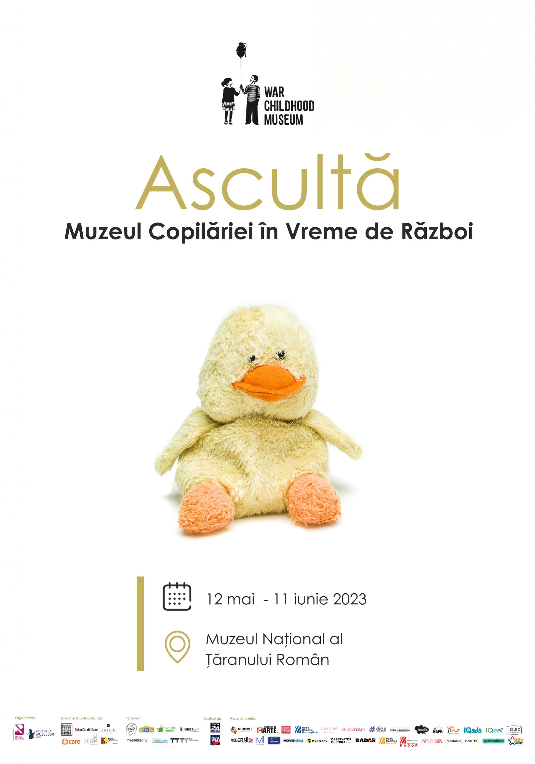 Expoziția „Ascultă” a faimosului muzeu din Sarajevo, War Childhood Museum / Muzeul Copilăriei în Vreme de Război, mai poate fi văzută până pe 11 iunie 2023 la Muzeul Național al Țăranului Român din București, sala Noua Galerie, cu acces gratuit. Invitatul special al ediției de anul acesta al Nopții Muzeelor, War Childhood Museum, este singurul muzeu din lume dedicat memoriei copiilor care au trecut prin experiența războiului și a fost distins în 2019 cu unul din cele mai prestigioase distincții – Premiul Muzeului Consiliului Europei.