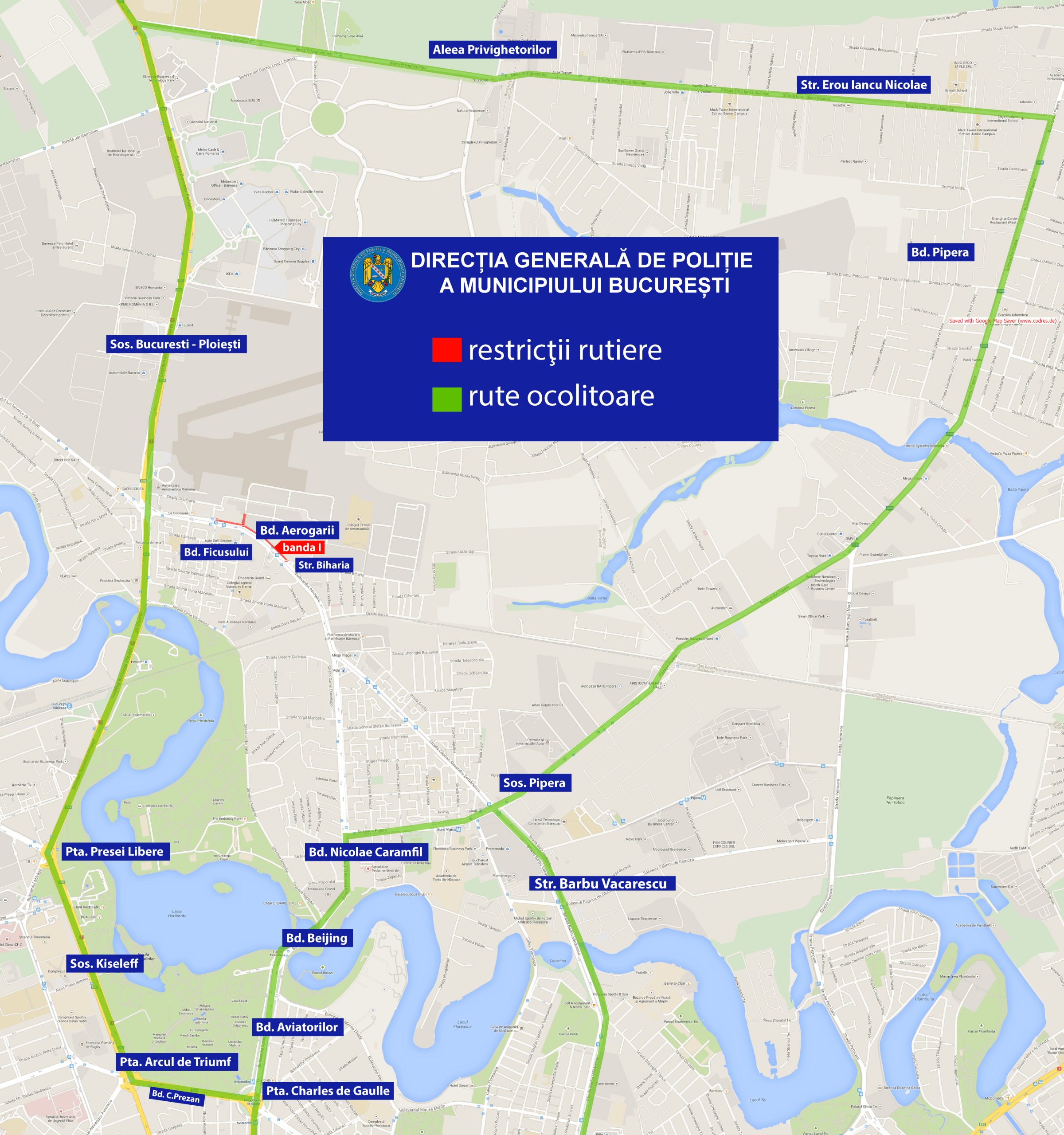 • Începând cu data de 22 iunie, ora 20:00, se va restricționa traficul rutier pe Ficusului, segmentul de drum cuprins între Bd. Aerogării și accesul în incinta Romaero.