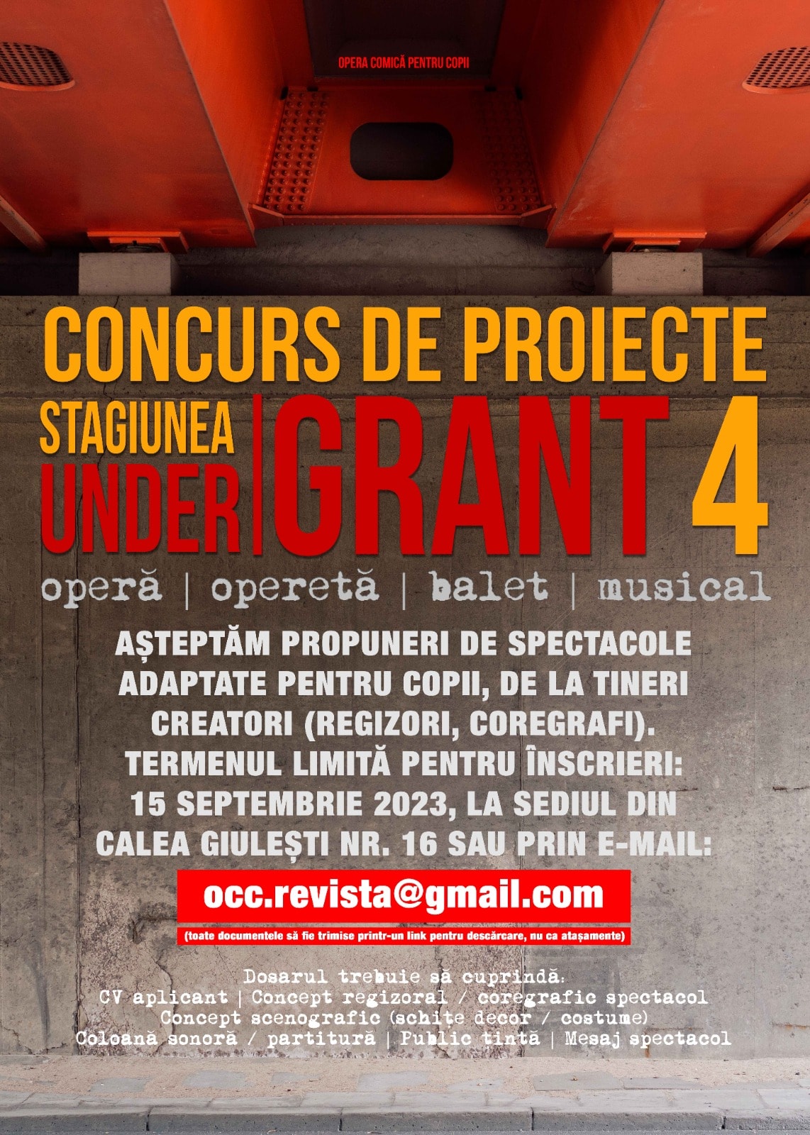 După succesele înregistrate cu spectacolele câștigătoare la precedentele sesiuni de proiecte – „Heidi”, „Onix și Barton”, „Erus și Valea Răbdării”, „Bastien și Bastienne”, Opera Comică pentru Copii vine din nou în sprijinul tinerilor creatori și organizează a patra ediție a concursului de proiecte „Stagiunea UnderGrant”.
