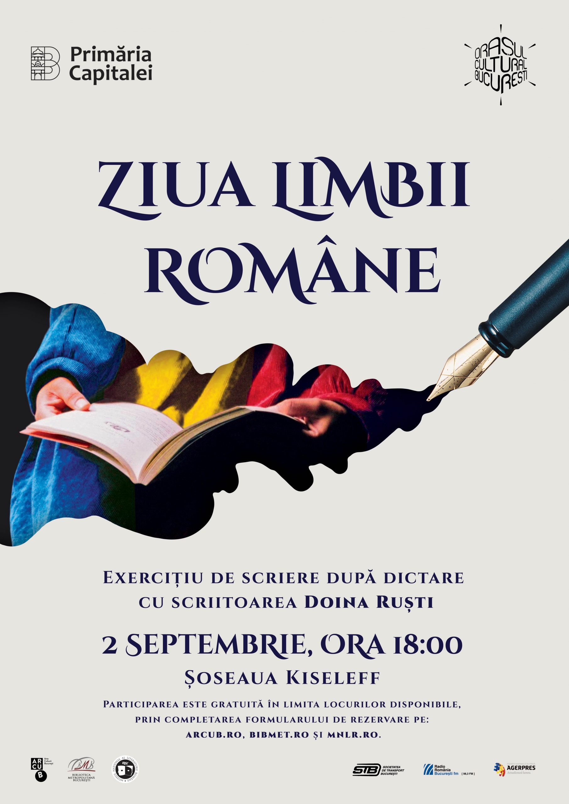 Bucureștenii sunt invitați, sâmbătă, 2 septembrie, de la ora 18:00, Rondul de pe Șoseaua Kiseleff, să celebreze Ziua Limbii Române în cadrul unui eveniment neconvenţional, organizat de Primăria Capitalei, prin Direcția Cultură, Turism, Învățământ a Municipiului București, alături de ARCUB – Centrul Cultural al Municipiului București, Biblioteca Metropolitană a Capitalei și Muzeul Național al Literaturii Române, inclus în programul proiectului outdoor „Străzi deschise – Bucureşti, Promenadă urbană”.