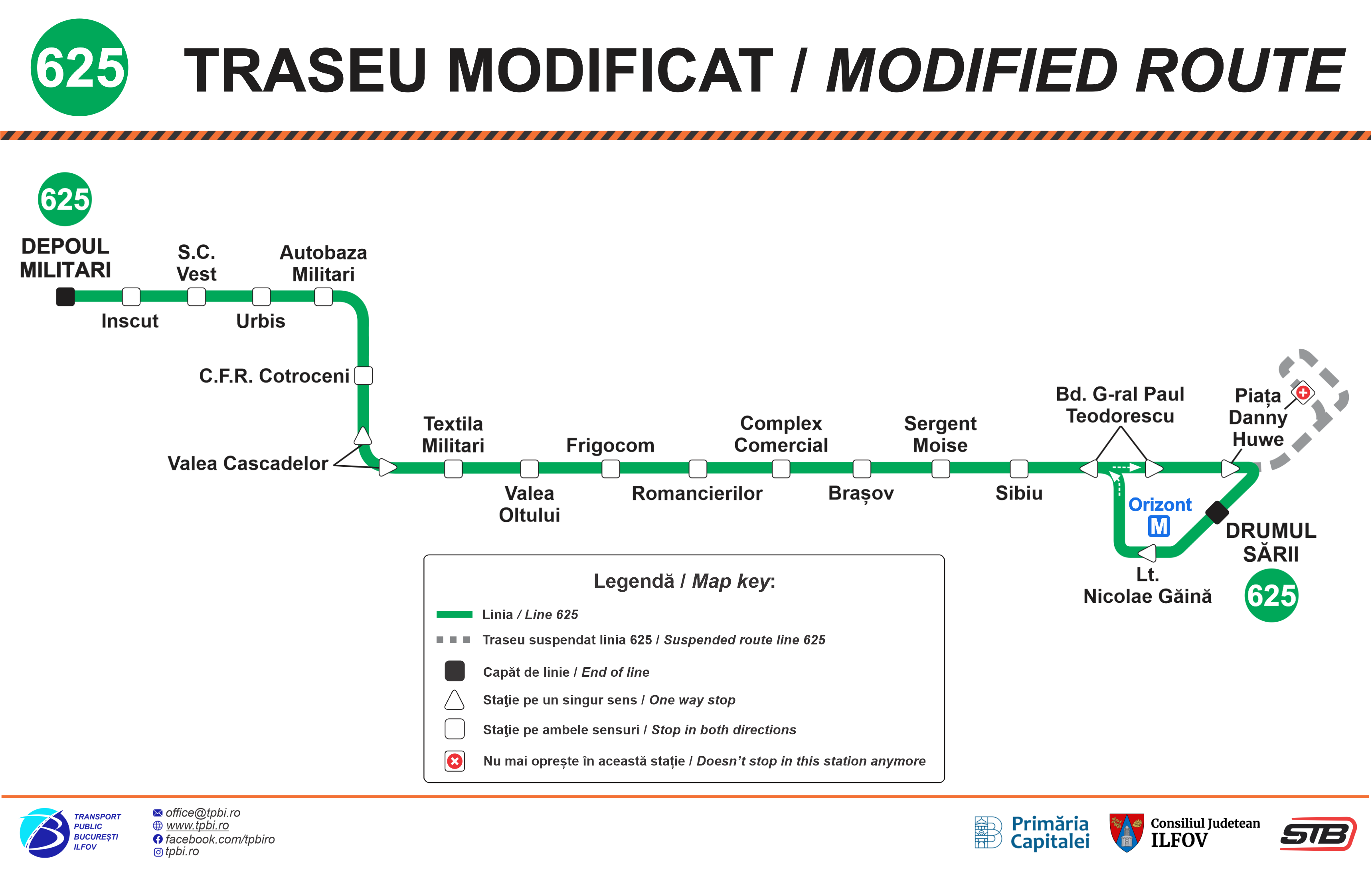 De sâmbătă, 26 august, traseul liniei navetă de autobuz 625 va fi modificat, din Bd. Timișoara, pe Drumul Sării, până la stația „Drumul Sării”, cu ȋntoarcere pe Drumul Taberei, Bd. General Paul Teodorescu, Bd. Timişoara, apoi traseul actual.