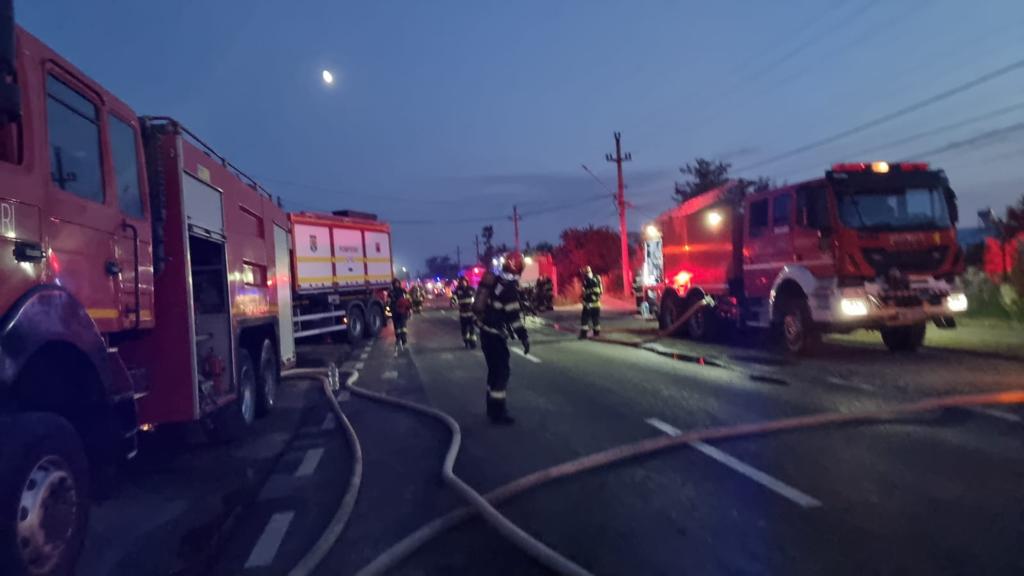 La faţa locului se intervine cu 10 autospeciale de stingere şi o autoscară.