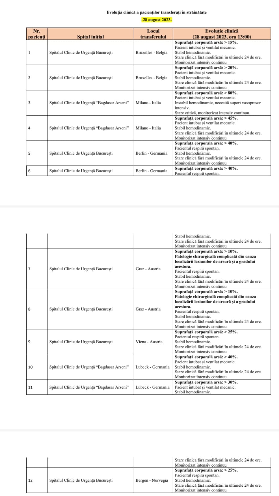 Potrivit MS, dintre cei 29 de pacienţi internaţi aflaţi în stare medie sau uşoară, 16 sunt internaţi la Spitalul Clinic de Urgenţă Bucureşti, 8 pacienţi – Spitalul Clinic de Urgenţă “Bagdasar Arseni” Bucureşti, trei la Spitalul Clinic de Urgenţă Chirurgie Plastică, Reparatorie şi Arsuri Bucureşti, unul Spitalul Universitar de Urgenţă Bucureşti, unul la Spitalul Universitar de Urgenţă Elias Bucureşti.