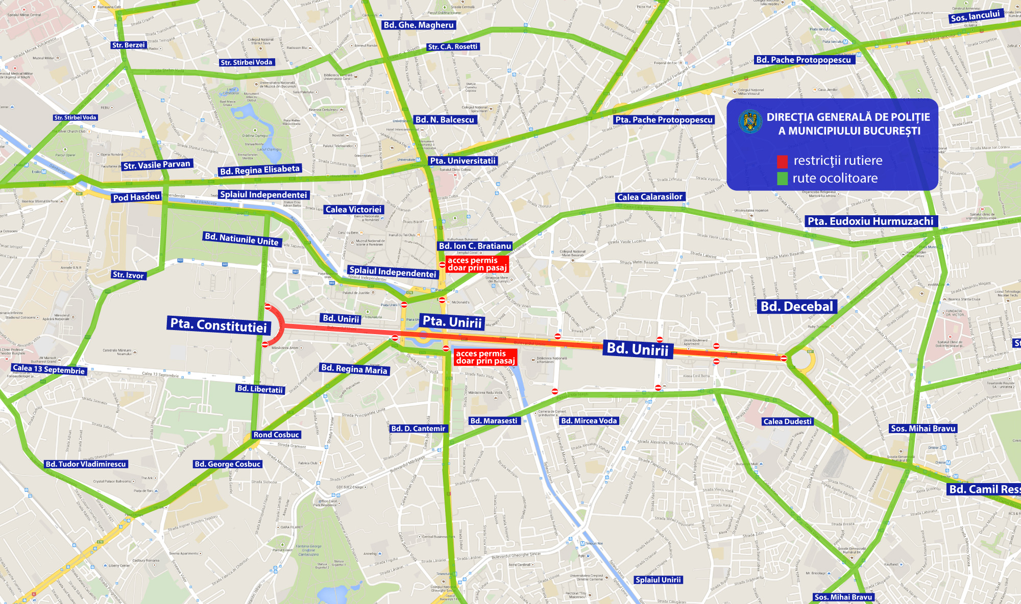Pentru buna desfășurare a evenimentului, între orele 17.00 – 22.00, se vor institui restricții de circulație pe traseul menționat, precum și pe străzile care acced în acest tronson.