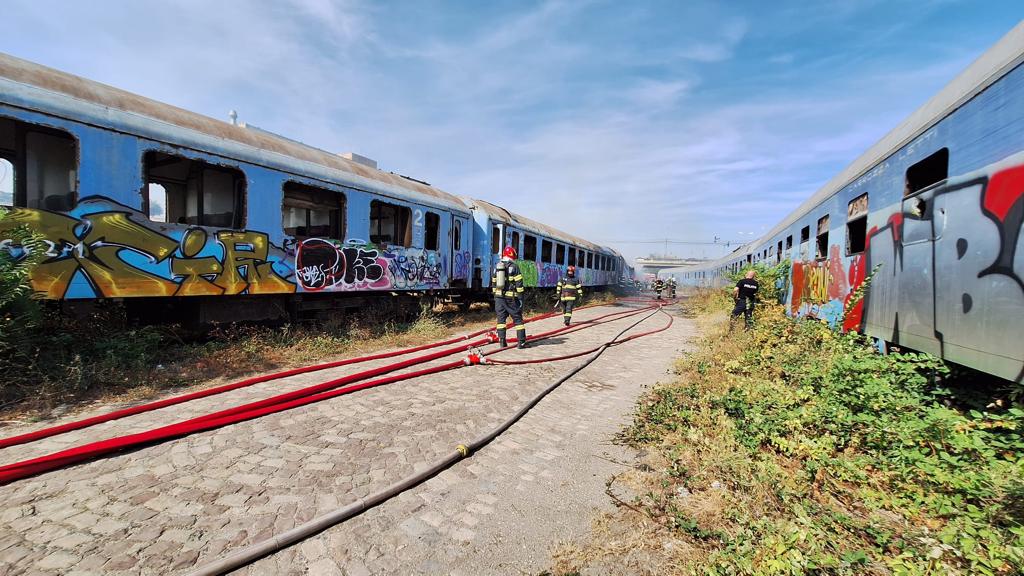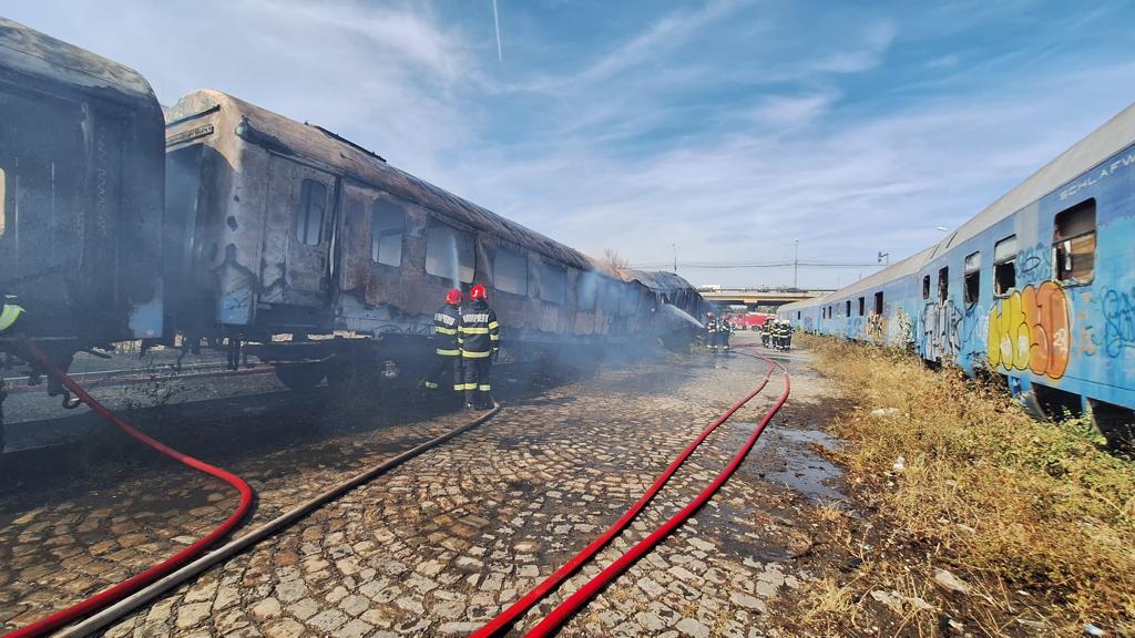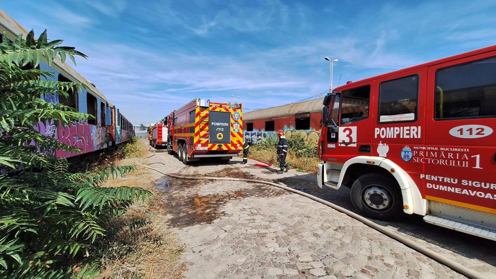 UPDATE: Trei vagoane dezafectate, aflate între Podul Grant şi Podul Basarab, au fost afectate de incendiul care s-a produs miercuri.