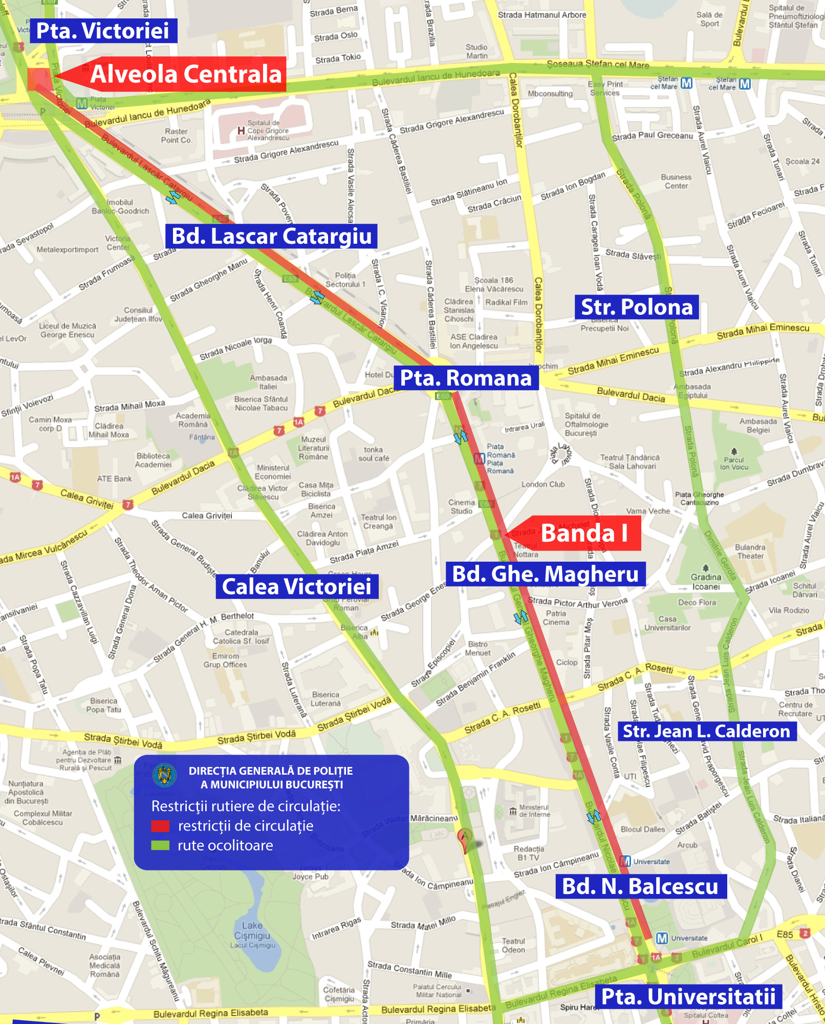 - între orele 15.00-16.30, deplasare pe banda I de circulație pe traseul: trotuarul aferent Teatrului Național, din Bd. Nicolae Bălcescu – Bd. Gheorghe Magheru – Piața Romană – Bd. Lascăr Catargiu – Piața Victoriei – alveola centrală;