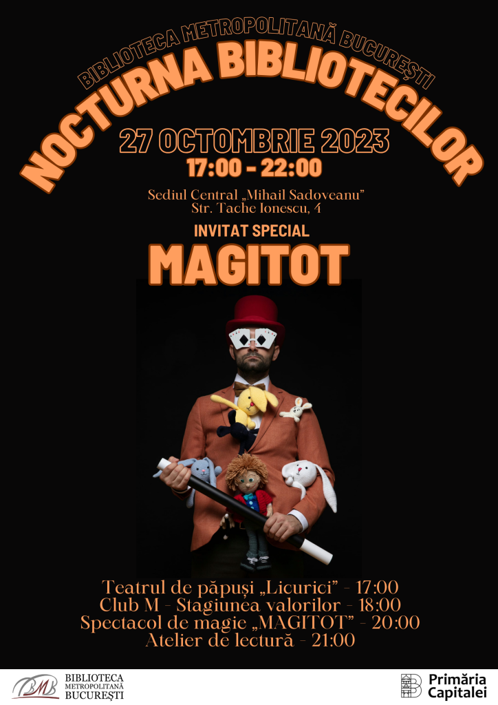 Biblioteca Metropolitană București (BMB) prin Direcţia Cultură, Învăţământ, Turism a Primăriei Municipiului Bucureşti invită publicul bucureștean la „Nocturna bibliotecilor” – o noapte plină de activități menite să transforme vizita la bibliotecă într-o experiență culturală inedită.