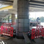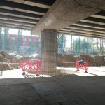 Dedesubtul pasajului se lucrează la consolidarea stâlpilor de rezistență și se va trece la consolidarea grinzilor.
