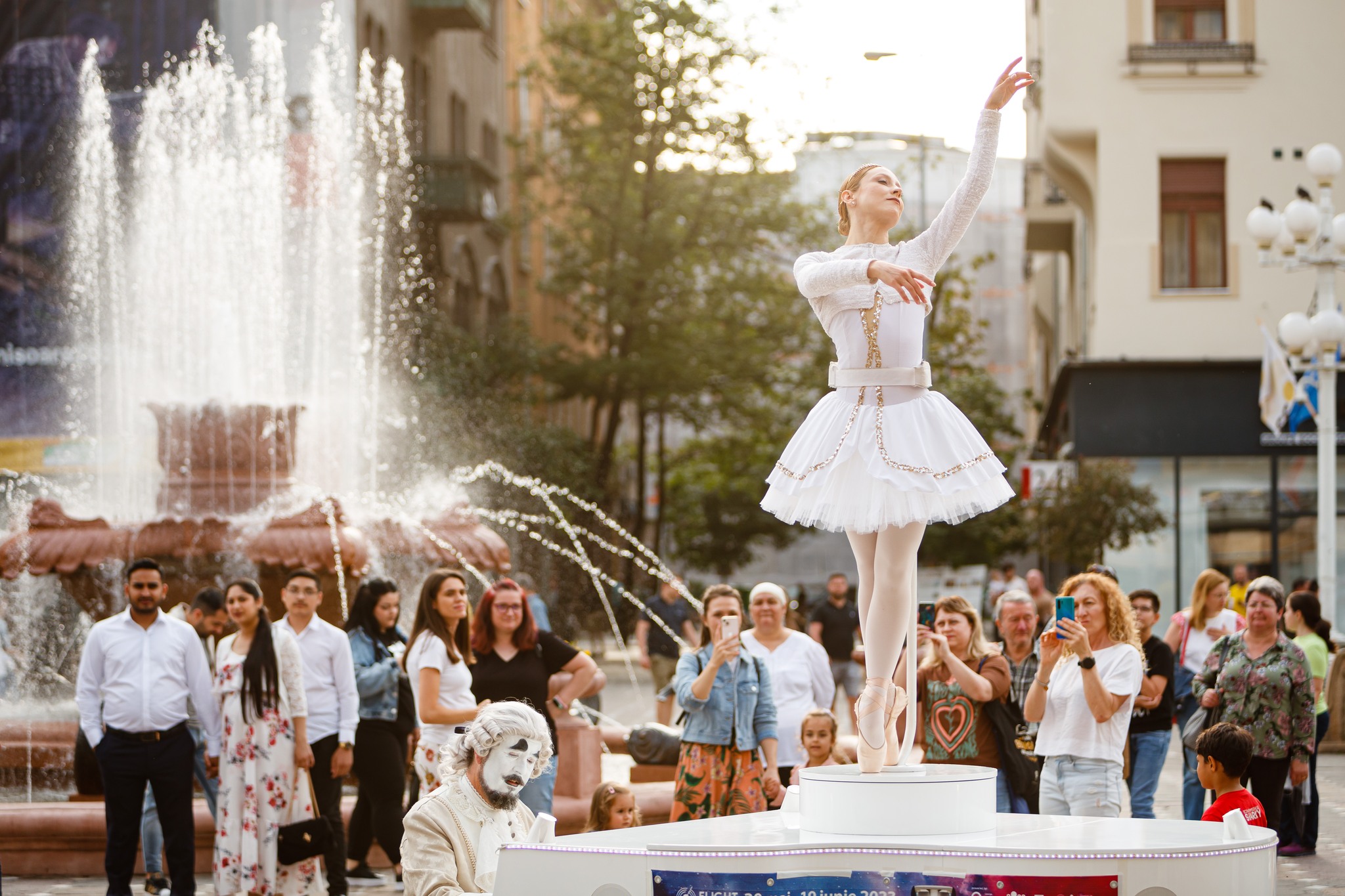 Sâmbătă, 11 noiembrie, la ora 18:30, în zona pietonală a Teatrului, compania International Show Parade (Italia), prezintă CARILLON, un performance stradal itinerant ce ne duce cu gândul la atmosfera romantică a Veneției. Melodia interpretată de pianist însoțește mișcările grațioase ale balerinei, într-o atmosferă ce îndeamnă la visare.