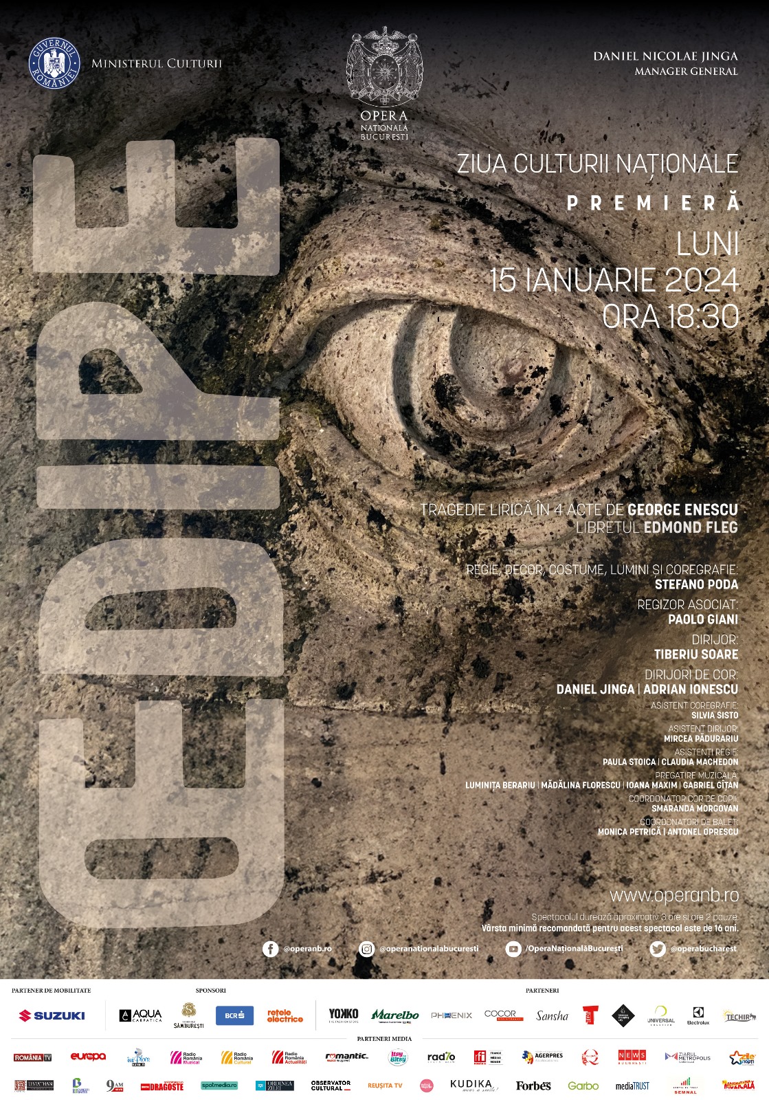 Luni, 15 ianuarie, ora 18:30, Opera Națională București prezintă premiera capodoperei „Oedipe” de George Enescu, cu prilejul Zilei Culturii Naționale. Regia, decorul, costumele, luminile și coregrafia poartă semnătura lui Stefano Poda. La pupitrul dirijoral se va afla maestrul Tiberiu Soare.