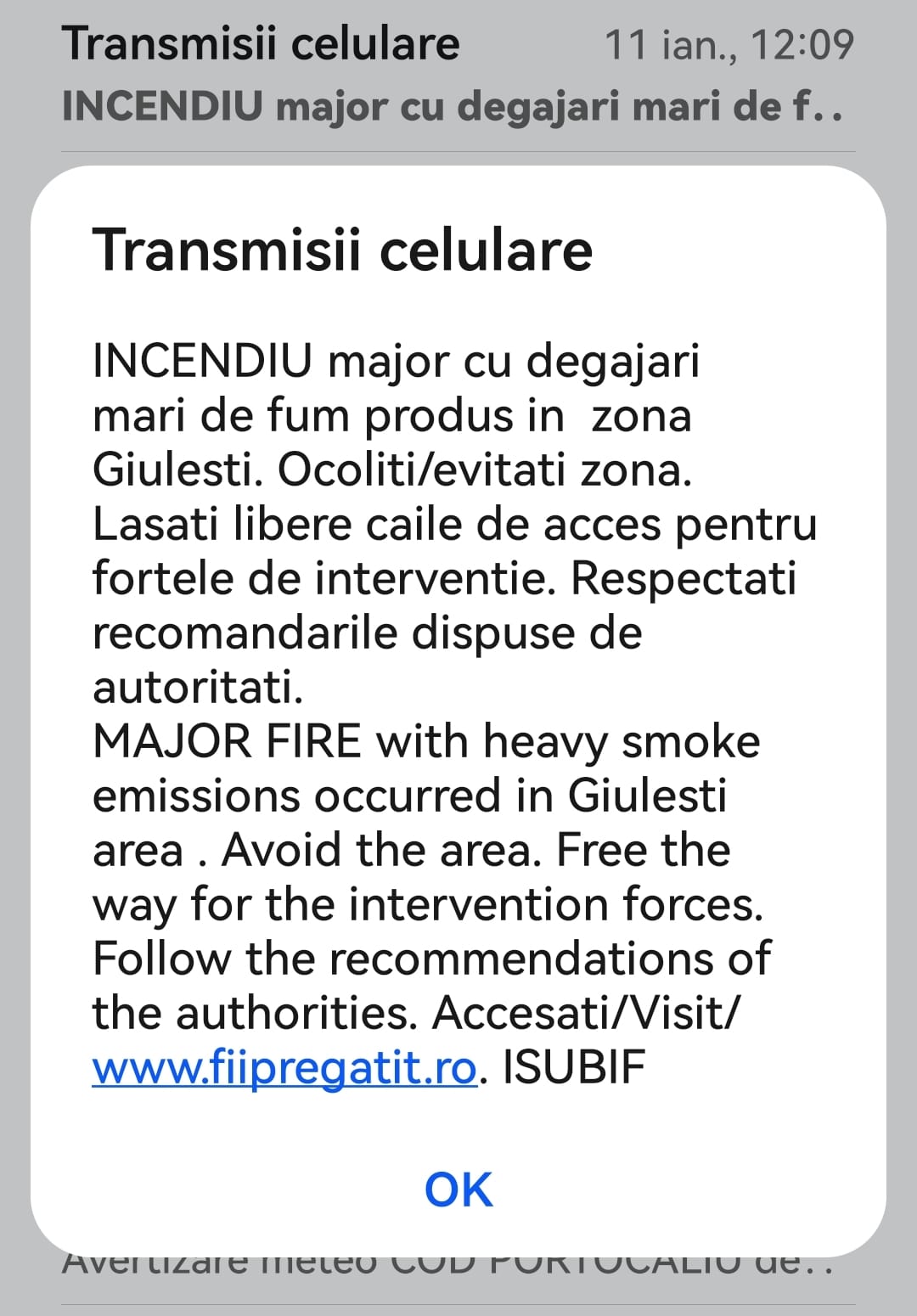 Având în vedere degajarea intensă de fum, pentru avertizarea si informarea populatiei a fost emis un mesaj prin sistemul Ro-Alert.
