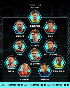 Totodată, jurnaliști sportivi cu experiență din întreaga lume și foști fotbaliști au ales și cei mai buni 11 jucători ai anului 2023, punându-i în aceeași formație. Manchester City, campioana Europei, a fost reprezentată, în această ”echipă ideală” de șase fotbaliști. Pe lângă Kyle Walker, John Stones, Ruben Dias, Kevin de Bruyne, Erling Haaland și Bernardo Silva, de la ”cetățeni”, și-au mai făcut loc, Thibaut Courtois, Jude Bellingham, Lionel Messi și Kylian Mbappe.