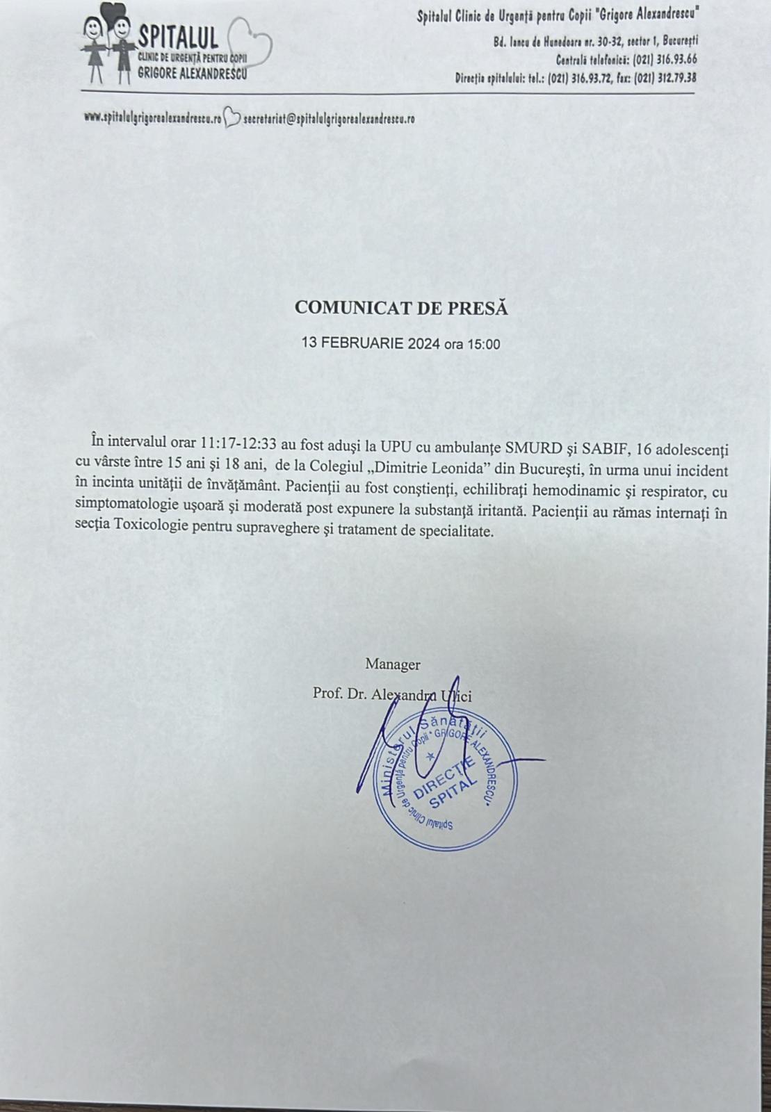 “Am fost informaţi de conducerea unităţii de învăţământ că s-a produs un incident – un elev de clasa a IX-a a pulverizat spray lacrimogen. Au fost afectaţi 33 de elevi. 25 de elevi au fost transportaţi la Spitalul Grigore Alexandrescu (14) şi Spitalul Marie Curie (11). Opt dintre copiii evaluaţi la faţa locului au refuzat transportul la spital. Ca măsură a mai fost luată şi evacuarea temporară a parterului unităţii de învăţământ – 91 de elevi. Există în momentul de faţă o anchetă în desfăşurare a organelor abilitate – a Poliţiei şi în paralel se vor desfăşura verificări şi la nivelul unităţii de învăţământ de către conducerea unităţii de învăţământ, în Comisia de Violenţă. În funcţie de ce vor descoperi se va acţiona în consecinţă – în speţă elevul poate fi sancţionat pe statutul elevului”, a declarat inspectorul de imagine Elena Ştefan din cadrul IŞMB.