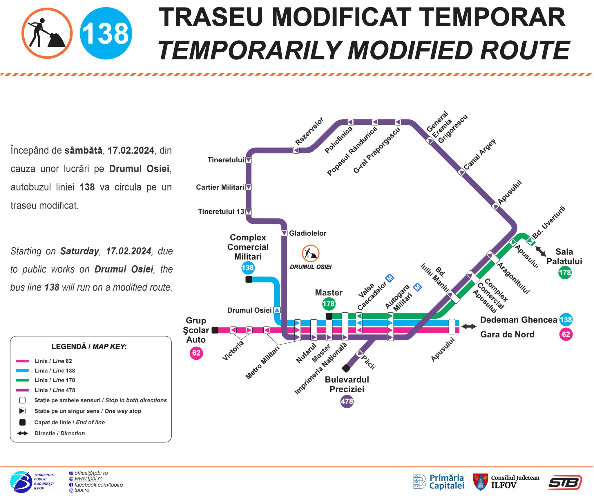 Traseul liniei 138 va fi modificat pe ambele sensuri pe Drumul Osiei, începând de sâmbătă, 17 februarie, în vederea fluidizării circulaţiei autobuzelor, informează Asociaţia de Dezvoltare Intercomunitară pentru Transport Public Bucureşti – Ilfov (TPBI).
