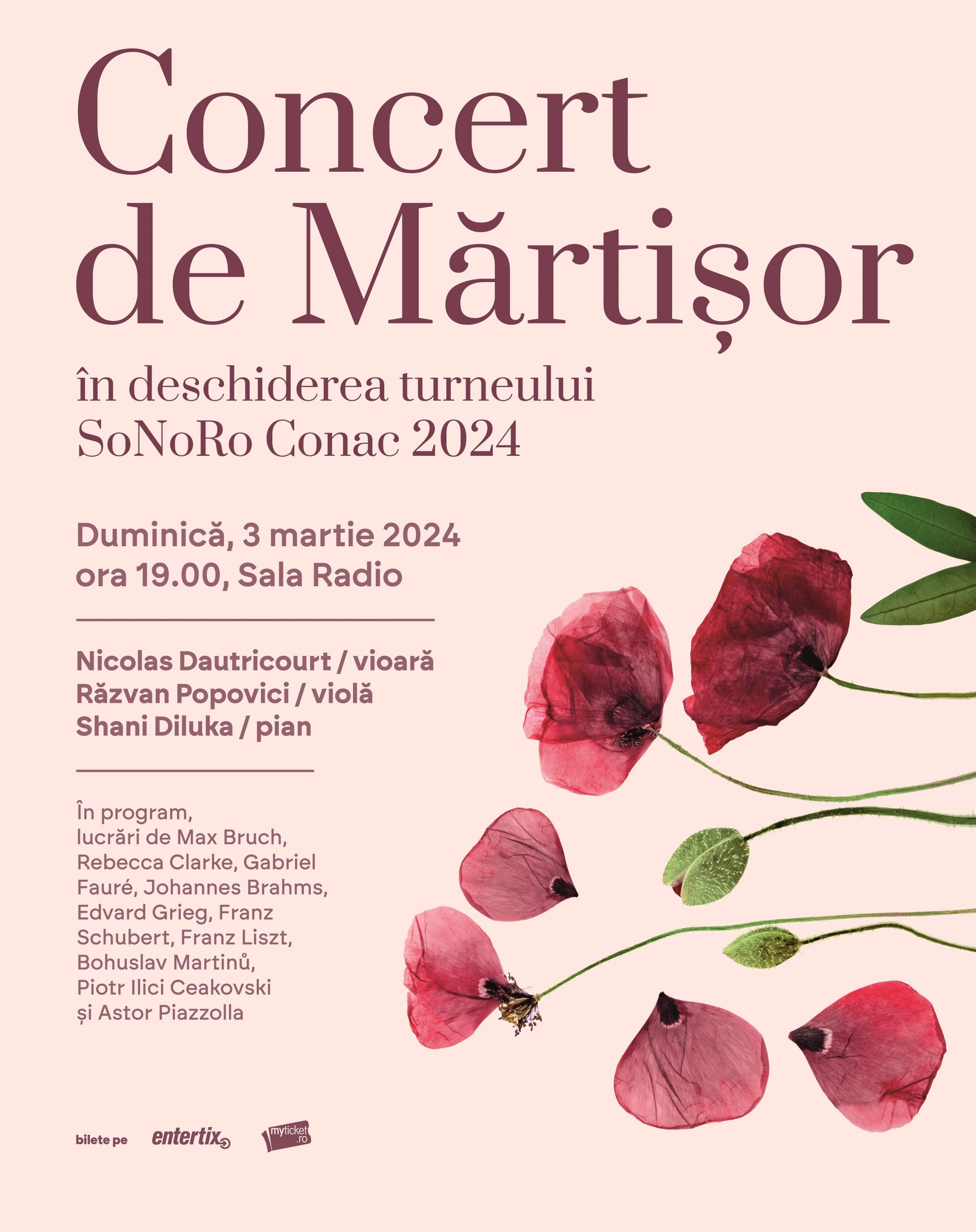 Duminică, 3 martie, ora 19:00, la Sala Radio este programată o sărbătorire a primăverii și a muzicii de cea mai înaltă calitate, cu un concert cameral ce demonstrează că muzica clasică este pentru toți. Concertul de Mărțișor, organizat de Asociația SoNoRo și Radio România Muzical, a devenit deja o frumoasă tradiție.