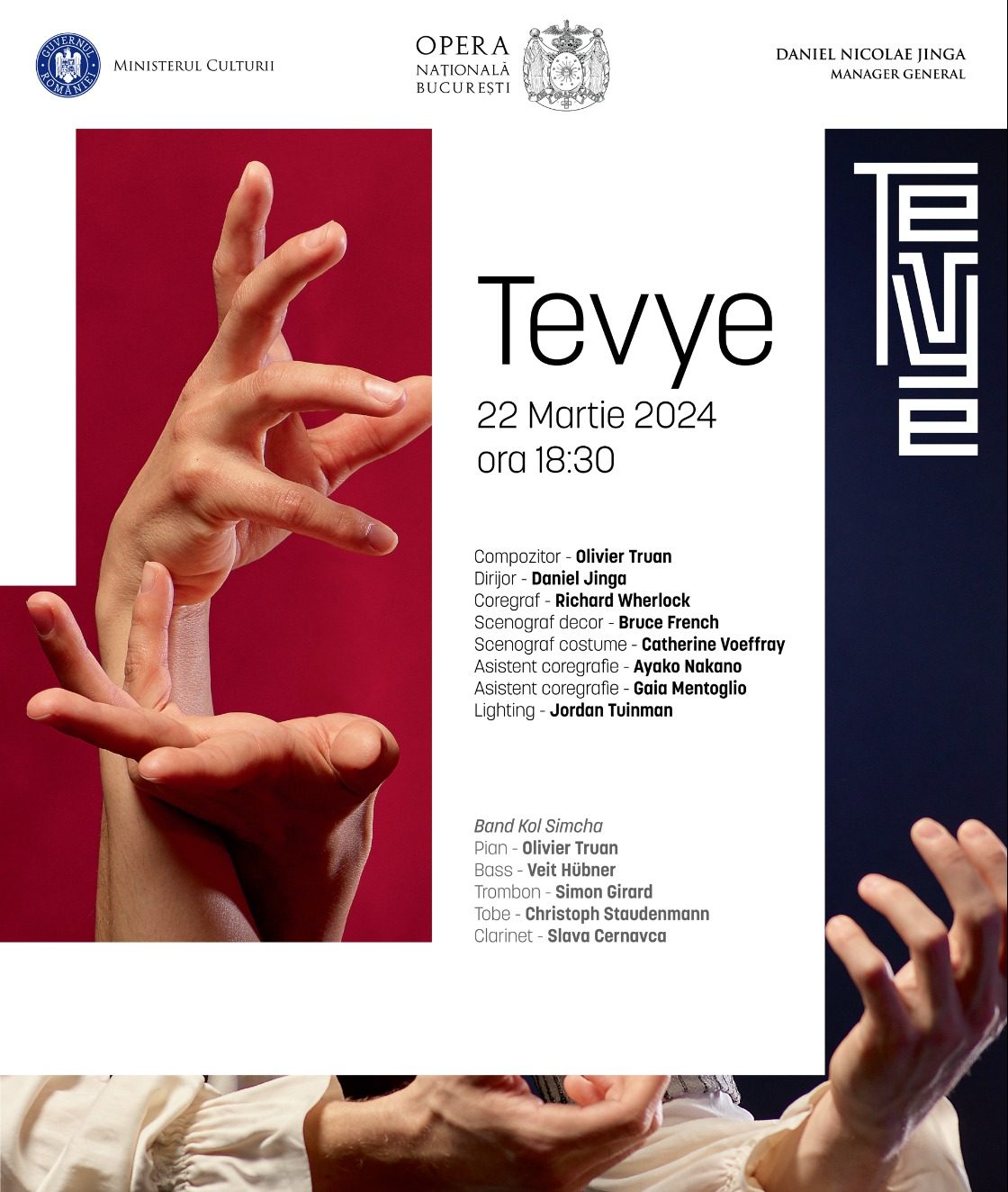 Joi (21 martie) și vineri (22 martie), ora 18:30, pe prima scenă lirică a Capitalei, vom putea admira, în premieră românească și sub bagheta dirijorului Daniel Jinga, spectacolul de dans contemporan Tevye de Olivier Truan.