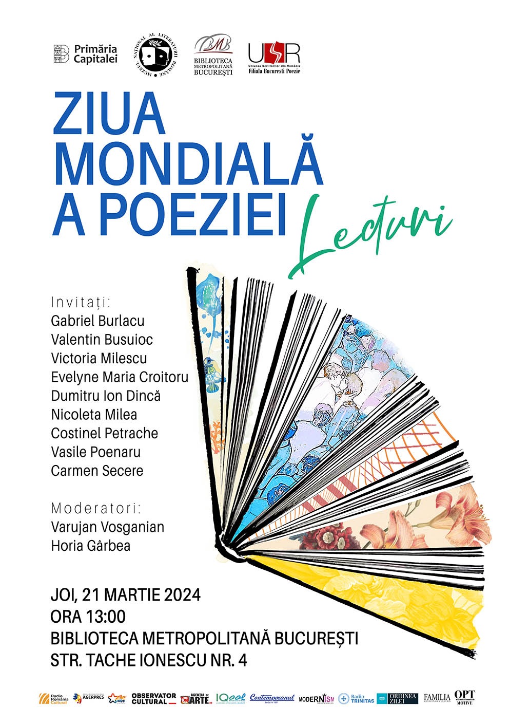 Muzeul Național al Literaturii Române, în parteneriat cu Biblioteca Metropolitană București și Uniunea Scriitorilor din România – Filiala București Poezie, vă invită joi, 21 martie 2024, de la ora 13:00, la sediul Bibliotecii Metropolitane din Str. Tache Ionescu nr. 4, la un eveniment dedicat Zilei Mondiale a Poeziei.