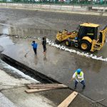 Până în acest moment, s-a intervenit în regim de urgență, cu forțe proprii, cu o folie ancorată cu saci de nisip pentru a opri provizoriu inflitrația apei.