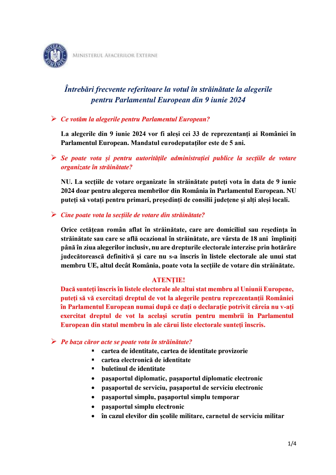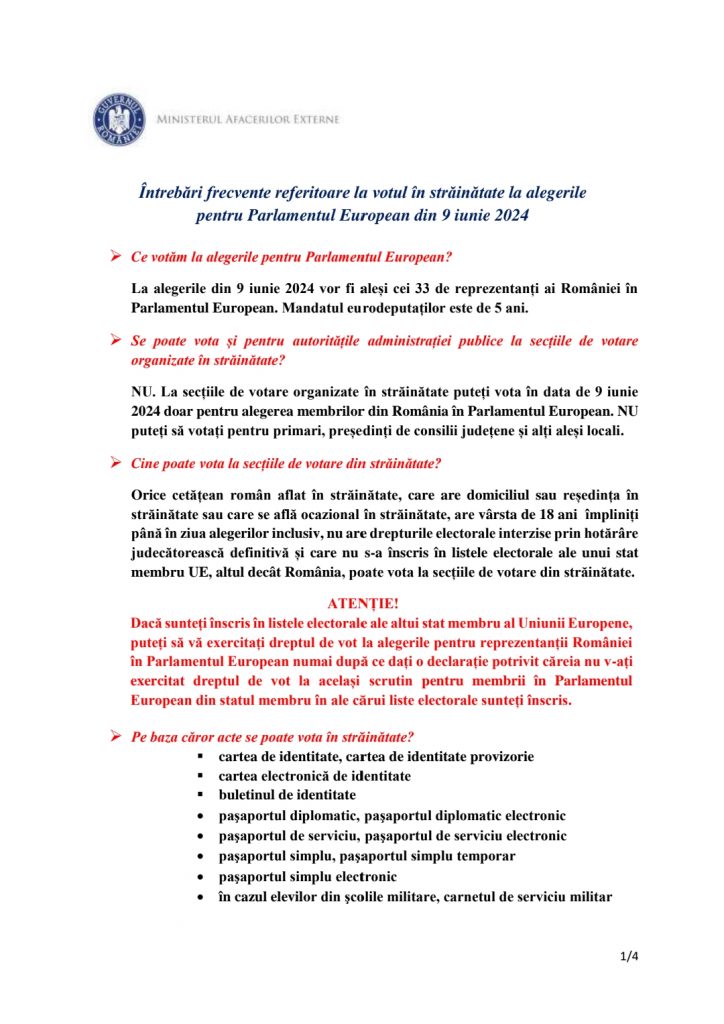 Ministerul Afacerilor Externe explică felul în care cetățenii români cu domiciliul sau reședința în străinătate își pot exercita dreptul de vot la alegerile europarlamentare 2024.