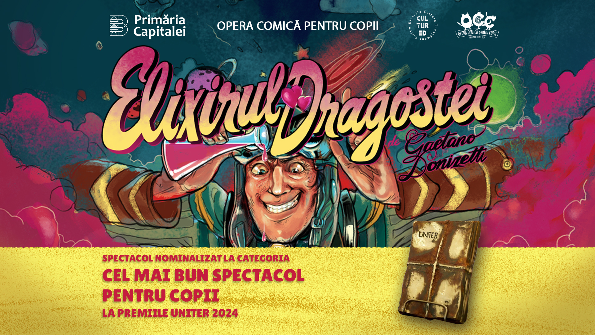UNITER – Uniunea Teatrală din România – acordă începând cu acest an premii și pentru producțiile instituțiilor de spectacole pentru copii. Opera Comică pentru Copii primește în premieră o nominalizare pentru Cel Mai Bun Spectacol pentru Copii, pentru spectacolul de operă „Elixirul dragostei” de Gaetano Donizetti (regia: Cristian Mihăilescu, scenografia: Adrian Damian). În acest context, pe 13, 14, 20 și 21 aprilie sunt programate patru reprezentații pentru public, cu juriul în sală, ale titlului nominalizat. Biletele sunt disponibile în rețeaua bilete.ro.