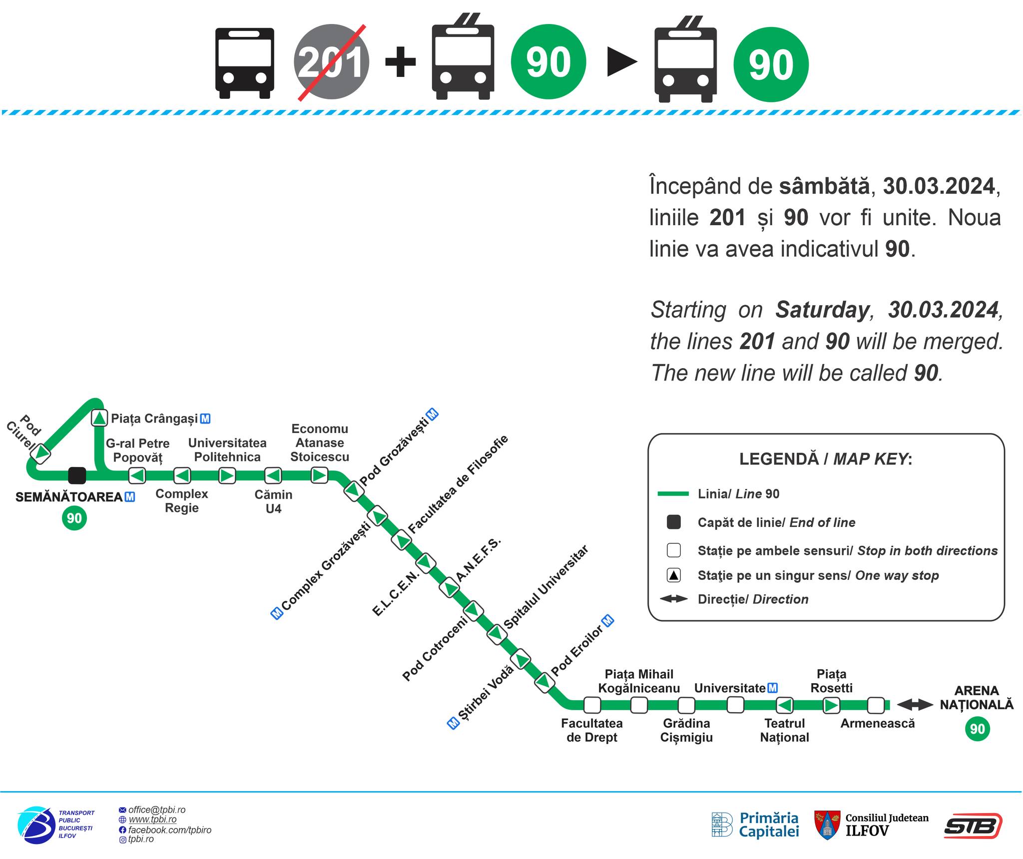 Traseele liniilor urbane 90 şi 201 se comasează, de sâmbătă, 30 martie, iar noul traseu organizat între terminalele “Arena Naţională” şi “Semănătoarea” va funcţiona cu indicativul 90, a anunţat joi Societatea de Transport Bucureşti (STB).