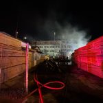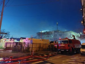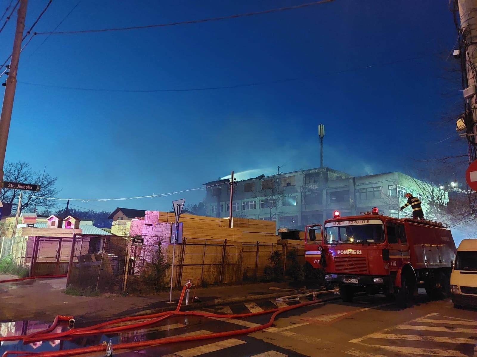 În interiorul spatiului de depozitare ard materiale combustibile (lemn). Incendiul s-a extins la acoperisul unei clădiri învecinate P+2E+M.