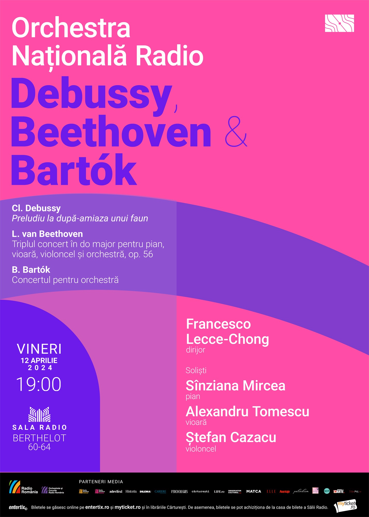 Biletele se pot achiziționa de la casa de bilete a Sălii Radio (tel. 021.314.68.00). Programul casei de bilete, pe www.orchestreradio.ro – secțiunea Bilete. Biletele sunt disponibile și în sistem online – pe entertix.ro și myticket.ro, dar şi în librăriile Cărtureşti.