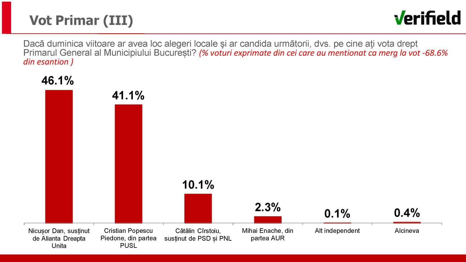 Astfel, la întrebarea “Dacă duminica viitoare ar avea loc alegeri locale şi ar candida următorii, dumneavoastră pe cine aţi vota drept Primarul General al Municipiului București?” răspunsurile au fost următoarele: