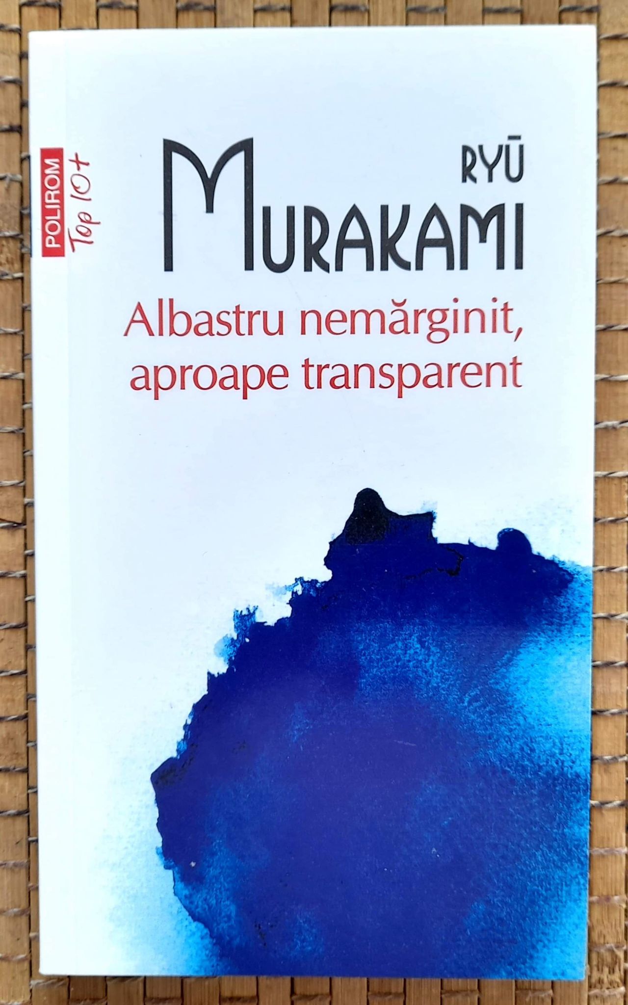 3 – Pe prima copertă, deasupra titlului, se află numele autorului, și anume Ryū Murakami, scriitor care nu are nicio legătură de rudenie cu Haruki Murakami. Vi se va întâmpla, cu siguranță, într-o viitoare discuție despre literatură, să fiți întrebat dacă l-ați citit pe Murakami (se pare că în ultima vreme, dacă nu l-ai citit pe Murakami, ești imediat catalogat drept un diletant în ale cititului). Lectura romanului „Albastru nemărginit, aproape transparent” vă poate salva reputația, veți putea astfel să răspundeți la întrebare cu un onest și hotărât: „Da, bineînțeles că l-am citit pe Murakami!”