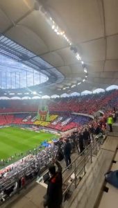 Duelul de pe cea mai mare arenă din țară a debutat cu o scenografie bine pregătită de galeria „roș-albastră”, în frunte cu liderul peluzei, Gheorghe Mustață. Mai multe plăcuțe colorate în nuanțele specifice formației bucureștene au fost ridicate deasupra capului de spectatorii prezenți pe stadion, iar în mijlocul Peluzei Nord, un banner 3D reprezentându-l pe căpitanul echipei, Darius Olaru care ridica trofeul de campion, a fost afișat, la rândul său.
