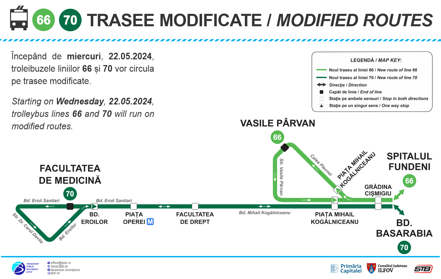 Astfel, linia 70 va funcționa între „Bd. Basarabia” și „Facultatea de Medicină” pe traseul: