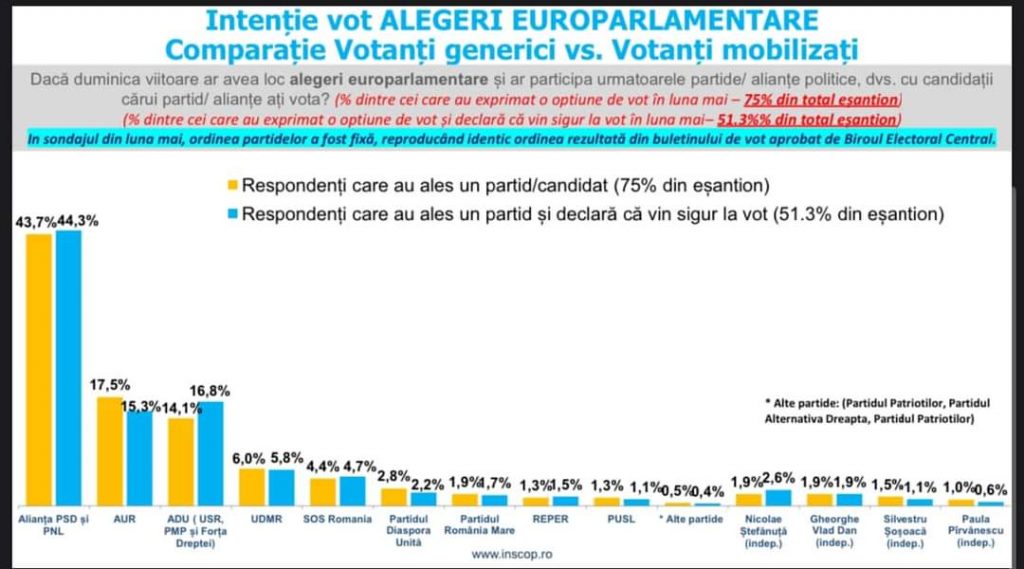 Conform sondajului de opinie realizat de către INSCOP Research la comanda News.ro, în ultima lună nu se observă modificări spectaculoase în intenția de vot a românilor rezidenți în țară pentru alegerile europarlamentare și locale, posibil și pe fondul unei campanii electorale foarte discrete. Sondajul INSCOP din luna mai întărește concluziile principale anterioare: Suma voturilor PSD și PNL la alegerile locale este semnificativ mai mare decât scorul Alianței electorale PSD-PNL la alegerile europarlamentare care domină clasamentul, AUR a coborât sub pragul de 20%, apropiindu-se de 15%, scorul cumulat AUR și SOS România este undeva la 20%, iar Alianța Dreapta Unită crește, dar foarte lent. Partidele mici care au depus liste pentru alegerile europarlamentare obțin rezultate foarte slabe, sub nivelul celor patru candidați independenți înscriși pe buletinul de vot. Rezultatele alegerilor pot fi influențate de eventuale evoluții ale campaniei electorale din ultimele două săptămâni, dacă aceasta va deveni mai dinamică. Un factor important va fi și votul din diaspora care va influența scorurile finale ale partidelor.”