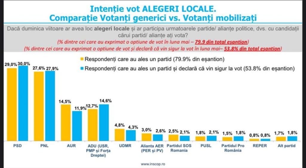 votanții generici), 16.8% Alianța Dreapta Unită (USR, PMP, FD) (față de 14.1% dintre votanții generici) și 15.3% AUR (față de 17.5% dintre votanții generici). Pentru UDMR ar vota 5.8% dintre alegătorii mobilizați (față de 6% dintre votanții generici), iar pentru Partidul SOS România ar vota 4.7% (față de 4.4% dintre votanții generici). Nicolae Ștefănuță ar fi votat de 2.6% dintre votanții mobilizați ( față de 1.9% dintre cei generici). Partidul Diaspora Unită ar obține 2.2% dintre voturile celor care declară că vin sigur la vot (față de 2.8% votanți generici). Gheorghe Vlad Dan ar obține 1.9% dintre voturile celor care declară că ar merge sigur la vot (față de 1.9% dintre voturile votanților generici). Partidul România Mare ar fi votat de 1.7% dintre votanții mobilizați (față de 1.9% dintre votanți generici). Partidul REPER ar fi ales de 1.5% dintre votanții mobilizați (față de 1.3% dintre votanții generici), iar PUSL de 1.1% (față de 1.3% dintre votanții generici) la fel ca Silvestru Șoșoacă (față de 1.5% dintre votanții generici). Sub 1% din alegătorii mobilizați își exprimă opțiunea pentru: Partidul Alternativa Dreaptă, Partidul Patrioților, România Socialistă șj candidatul independent Paula Pîrvănescu.