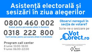 Cei interesați pot suna la numărul de telefon Telverde 0800 460 002 – gratuit în România sau 0318.222.800 – tarif normal pentru străinătate. Call Center-ul va fi activ pe 8 iunie, în intervalul 10:00 – 18:00 și pe 9 iunie, în intervalul 6:00 – 22:00. Mai multe detalii despre call center pe www.votcorect.ro.