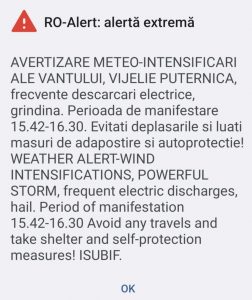 In intervalul 16.52 – 17.30. Se vor semnala averse care vor acumula peste 35…40 l/mp, grindina, frecvente desc. electrice. Zone afectate: 3 localitati din Ilfov: Buftea, Ciorogârla, Dragomirești-Vale;
