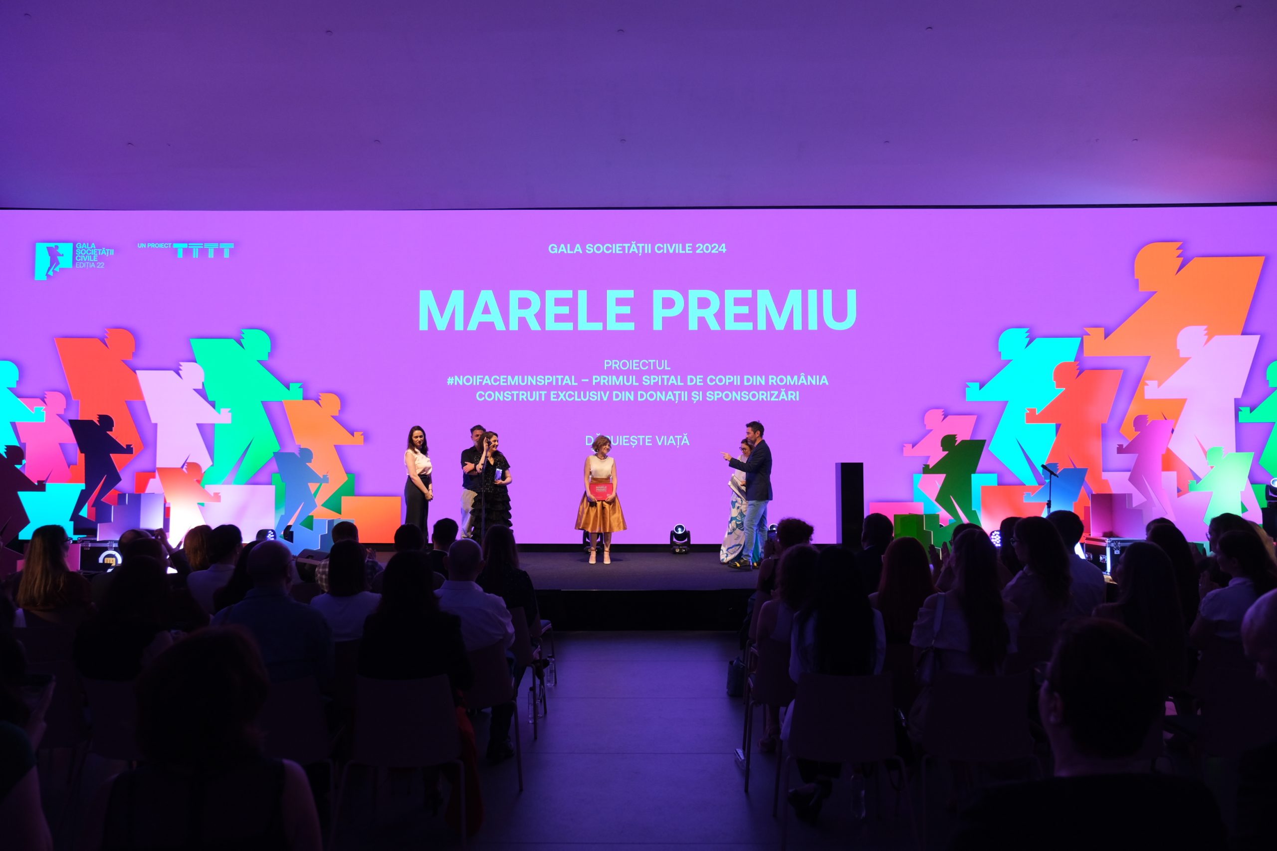 Gala Societății Civile, un proiect The Institute, a premiat câștigătorii competiției aseară, 20 iunie, în cadrul Festivității de Premiere. Marele Premiu al Galei Societății Civile 2024 a fost oferit Asociației Dăruiește Viață, pentru proiectul #NoiFacemUnSpital, proiect ce are ca scop construirea unui spital de copii de la zero, exclusiv din donații și sponsorizări, un spital la standarde europene, folosind norme actuale și respectând circuitele medicale adecvate, în care cadrele medicale să-și poată face meseria așa cum visează.