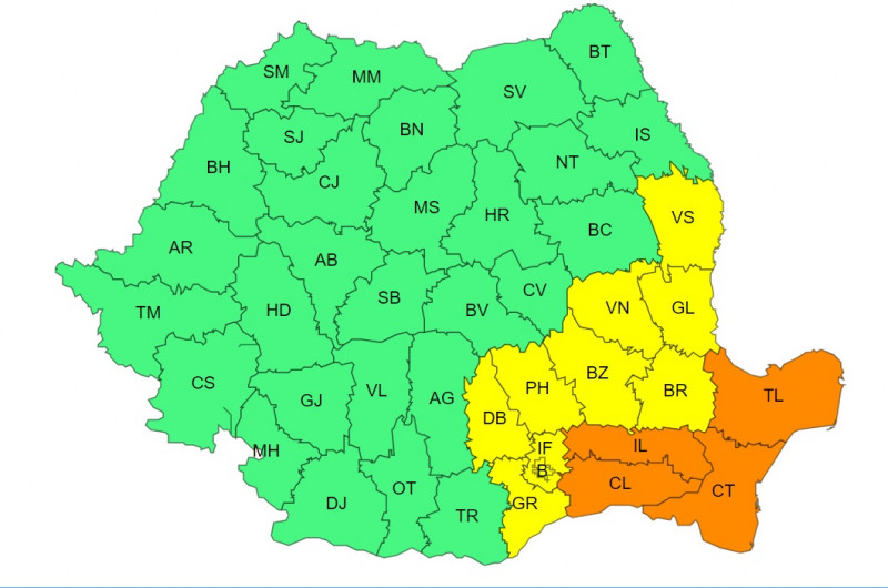 Cea de-a doua avertizare, de tip cod portocaliu de instabilitate atmosferică accentuată, este valabilă de la ora 13.00 la ora 20.00 în județele Ialomița, Călărași, Constanța și Tulcea.