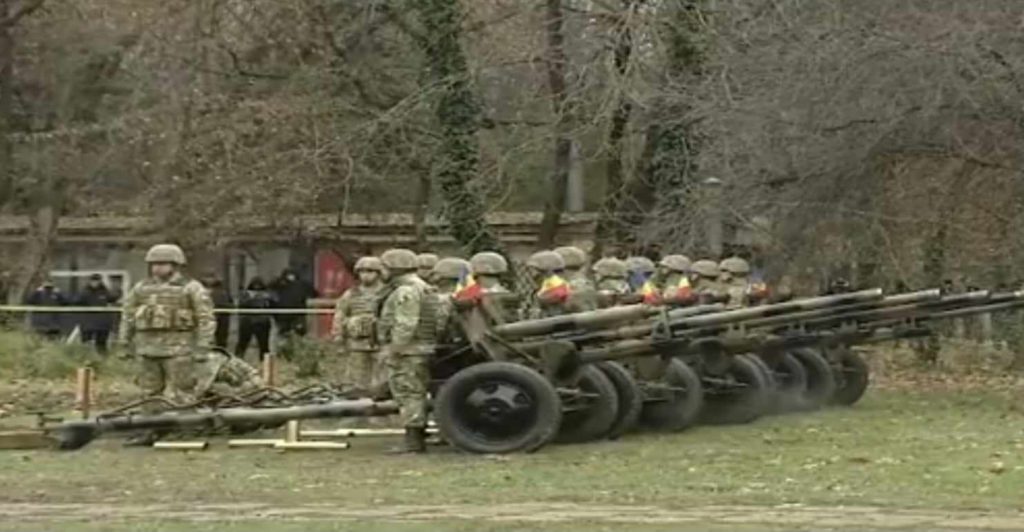 Pe timpul intonării Imnului Naţional al României, în semn de omagiu şi respect pentru această sărbătoare a tuturor românilor, militarii Bateriei salve şi aruncătoare de 120 de milimetri a Brigăzii 30 Gardă ‘Mihai Viteazul’, comandată de locotenentul Ştefan Chiriţoiu, au executat 21 de lovituri de tun cu muniţie de manevră, calibrul 76 mm.