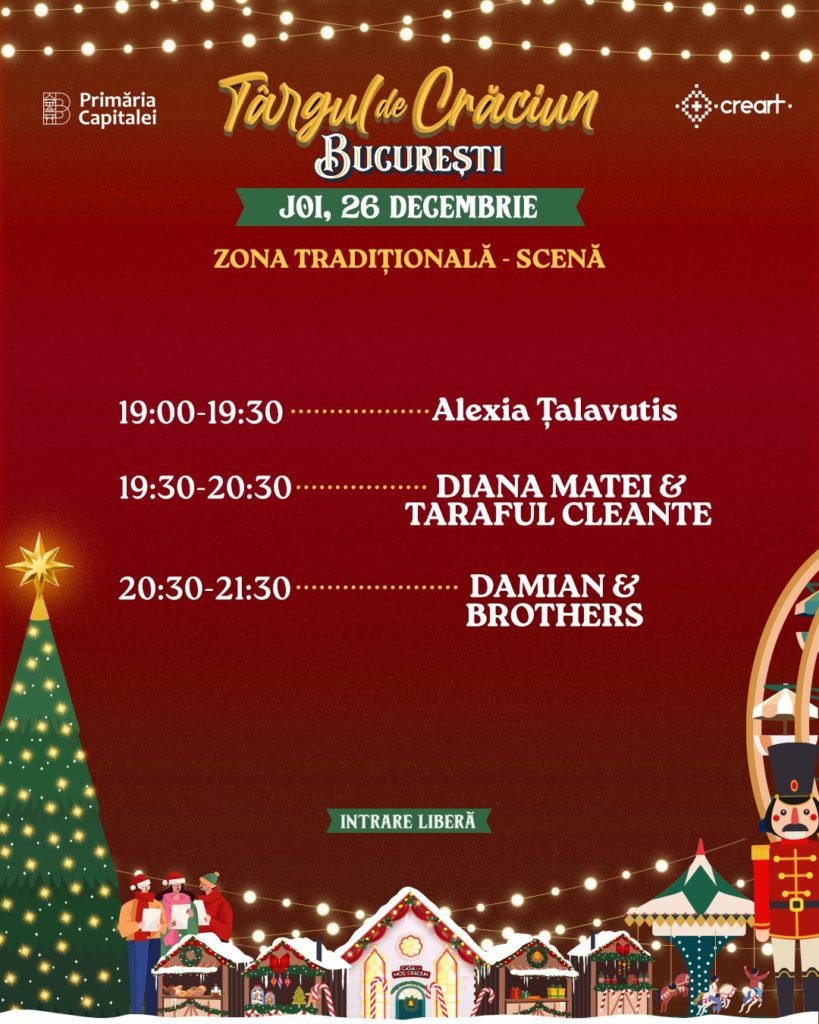 ”Joi, 26 decembrie, Târgul de Crăciun București te așteaptă cu un program plin de energie și bucurie. ? Hai să prelungim distracția și să trăim împreună magia sărbătorilor în ultima zi pe care o petrecem în Piața Constituției! ?”, se arată pe pagina de Facebook a evenimentului.