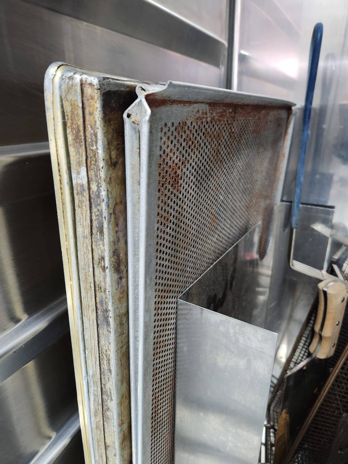 Ustensilele utilizate în procesul de producție erau uzate și neprofesionale, iar tăvile de coacere prezentau semne avansate de arsuri.
