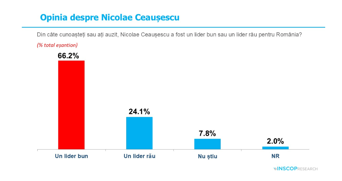 Potrivit studiului, aproximativ două treimi dintre români îl percep pe Nicolae Ceaușescu ca un lider bun pentru România, în timp ce doar 24% îl consideră un lider rău.