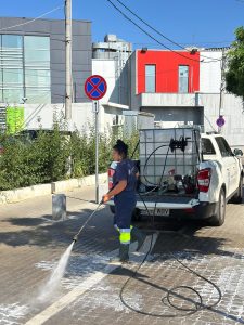 Pentru doar 10 metri pătrați murdăriți de porumbei, echipele muncesc două ore și consumă 700 de litri de apă și 15 litri de detergent. A doua zi reiau activitatea…