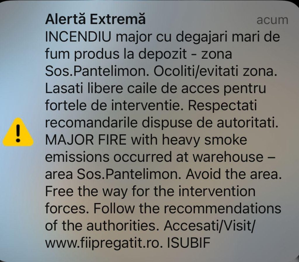 Autorităţile au emis mai multe mesaje RO-ALERT în care avertizează cu privire la fumul degajat de incendiu. Ultimul mesaj a fost emis în sectoarele 2, 3, 4 şi 5, potrivit ISU Bucureşti-Ilfov.