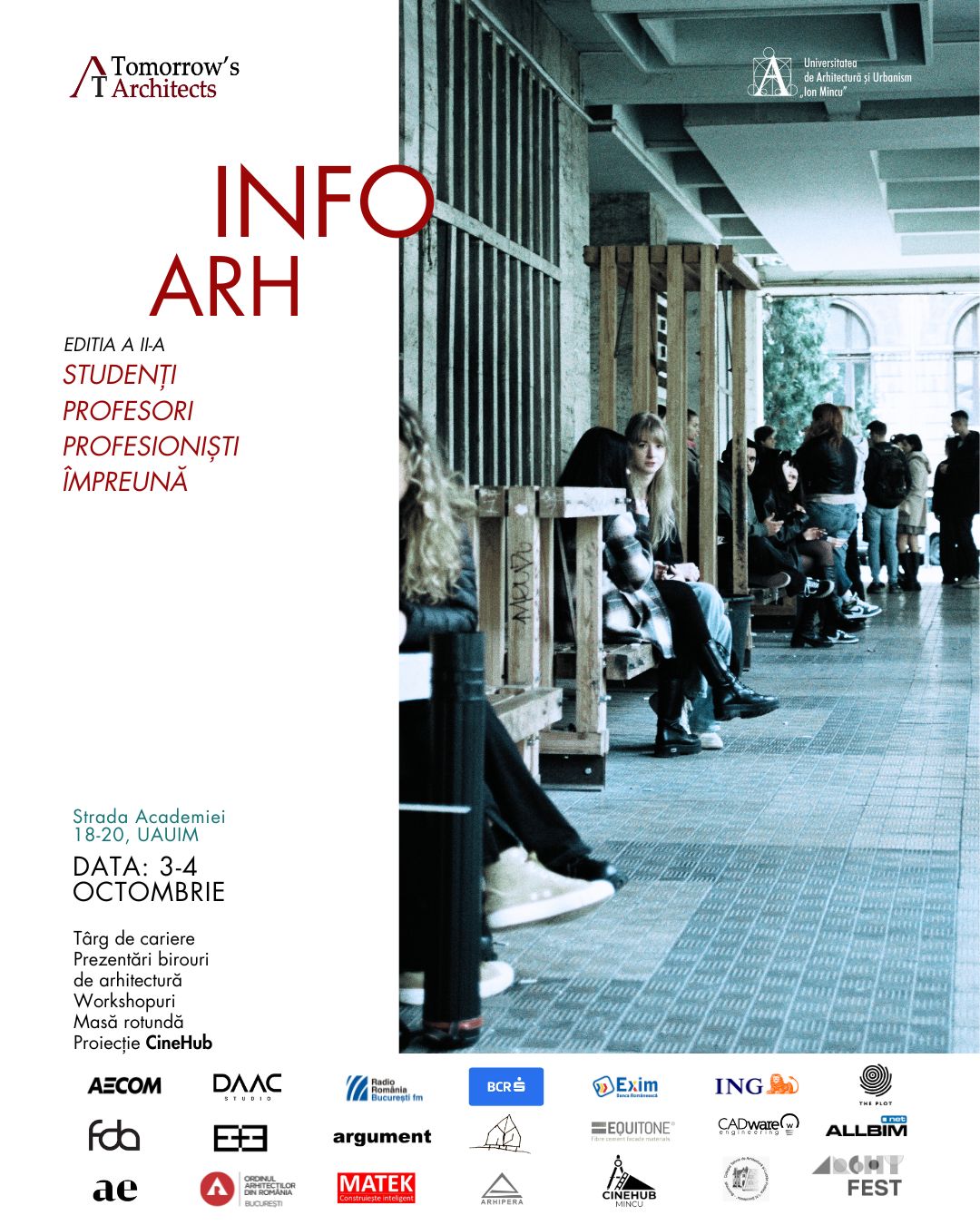În perioada 3-4 octombrie 2025, Universitatea de Arhitectură și Urbanism „Ion Mincu” din București va găzdui cea de-a doua ediție a InfoArh, eveniment organizat de Asociația Tomorrow’s Architects în colaborare cu Archy Fest și dedicat formării viitorilor arhitecți.