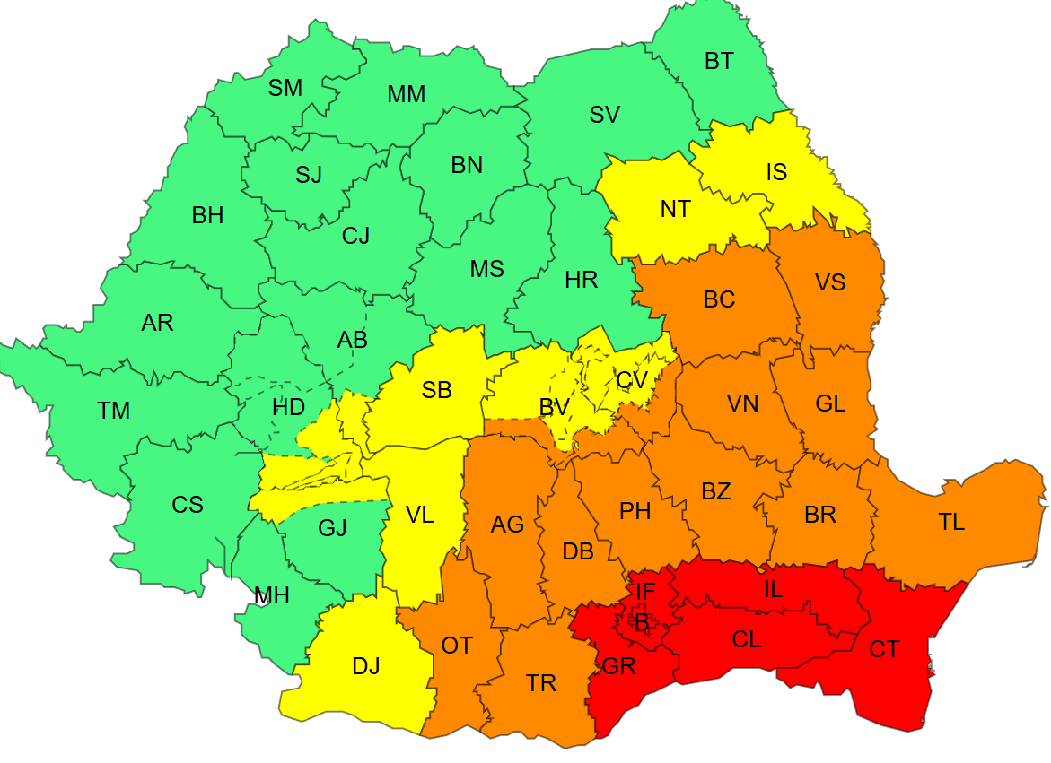 Pentru restul regiunilor sudice și estice ale țării, a fost emis un Cod portocaliu de ploi importante cantitativ, iar în zonele montane înalte este valabil un Cod galben de ninsori viscolite și vânt puternic, cu rafale de până la 90 km/h.