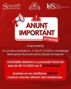 ‘Ca urmare a codului roșu de ploi torențiale emis de Administrația Națională de Meteorologie pentru Municipiul București și a Hotărârii nr. 11/07.10.2025 a Comitetului Municipiului București pentru Situații de Urgență, privind condițiile meteorologice nefavorabile ce vor avea loc mâine, 8 octombrie a.c., Consiliul de Administrație al Universității Naționale de Știință și Tehnologie Politehnica București a decis suspendarea activităților didactice în data de 08 octombrie a.c., pentru siguranța cadrelor didactice și a studenților. Activitățile didactice vor fi recuperate în cel mai scurt timp posibil, conform planificării cadrelor didactice. Personalul didactic auxiliar și nedidactic își va desfășura activitatea conform programului normal de lucru, pentru a asigura buna funcționare a universității în această perioadă’.