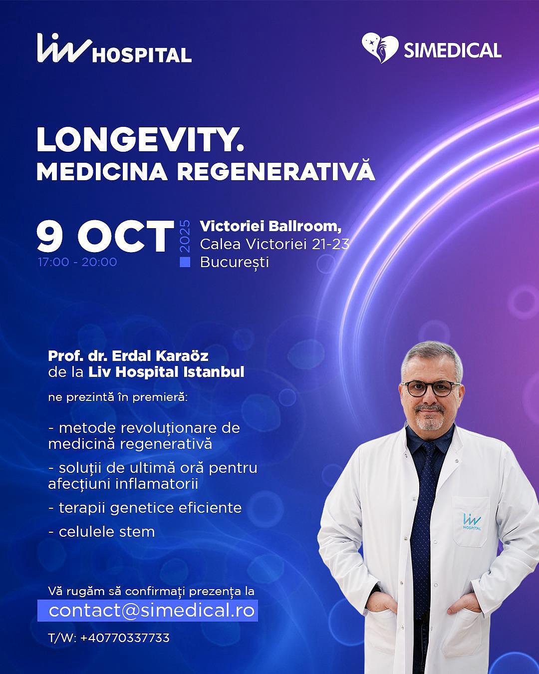 Astfel, pacienților români le este facilitat accesul direct la cele mai inovatoare tratamente din medicina regenerativă de către Simedical România, prin organizarea unui eveniment exclusiv dedicat longevității și terapiilor celulare, alături de unul dintre cei mai reputați experți internaționali: Prof. dr. Erdal Karaöz de la Liv Hospital Istanbul