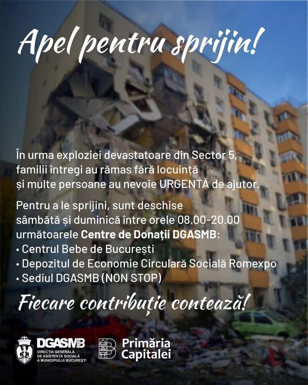 Dat fiind că multe familii au rămas fără locuințe, acestea au nevoie urgentă de haine, mâncare și produse de igienă, dar lucrurile trebuie duse la centrele de donații deschise de DGASMB.
