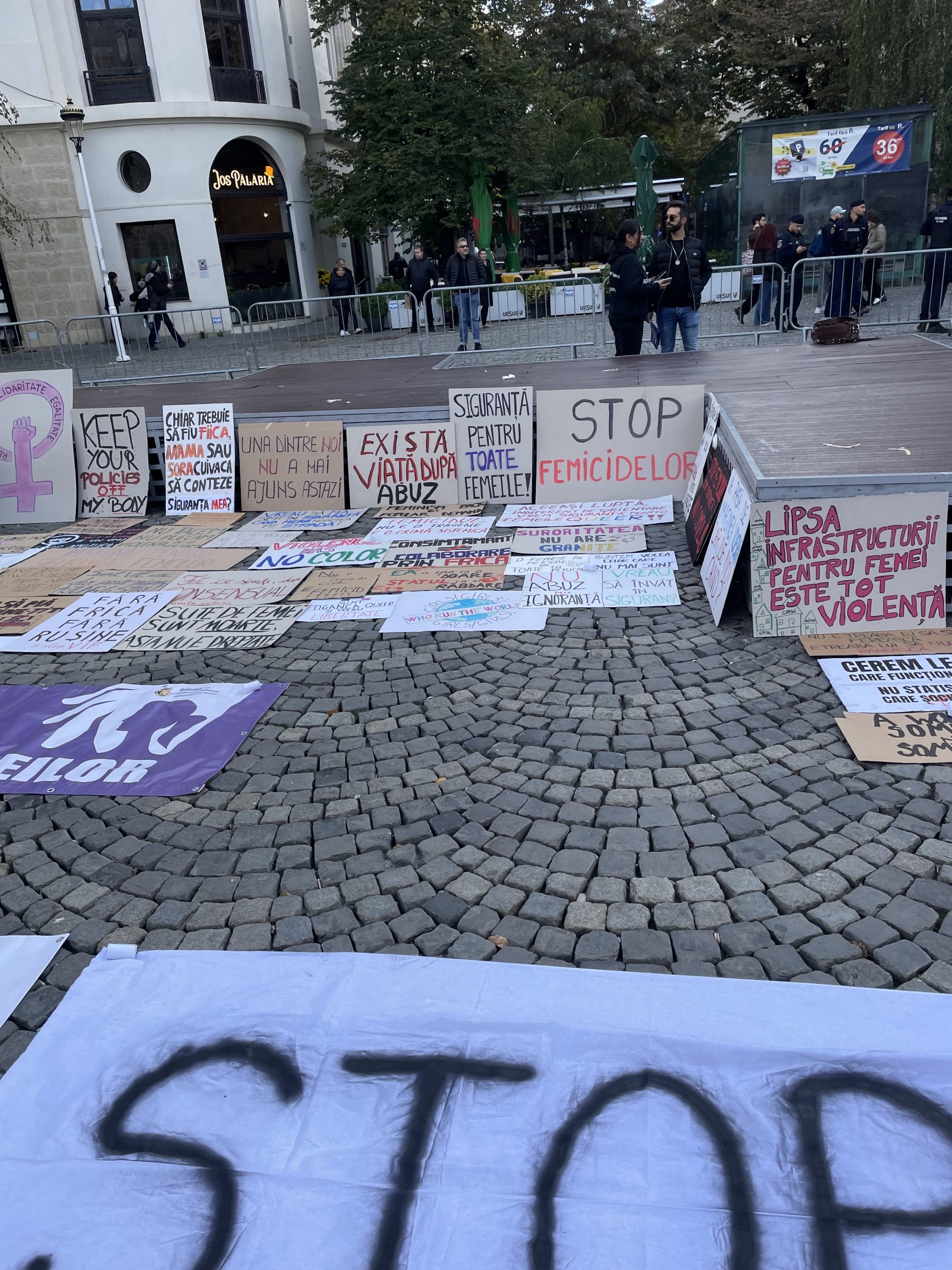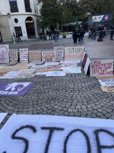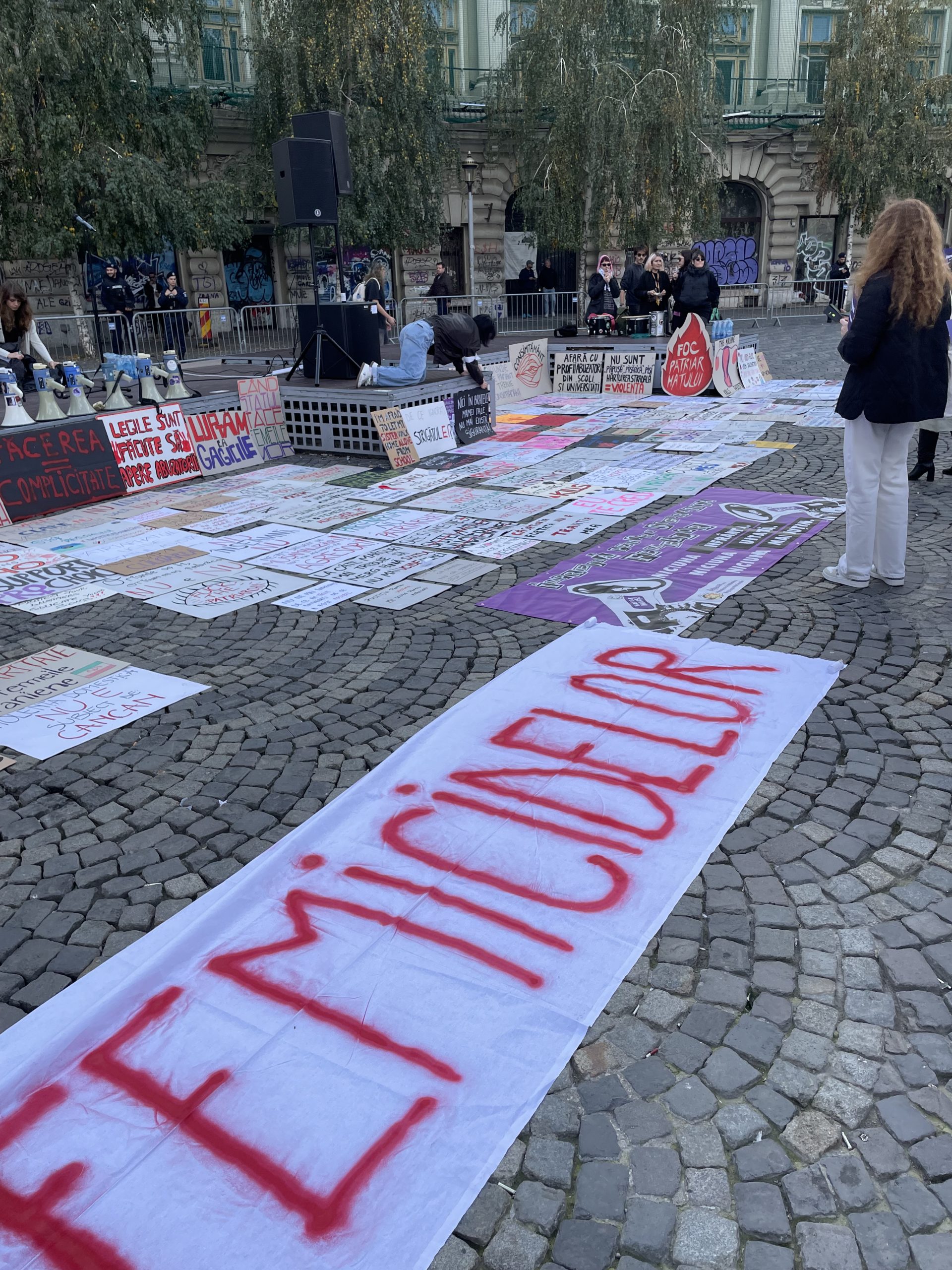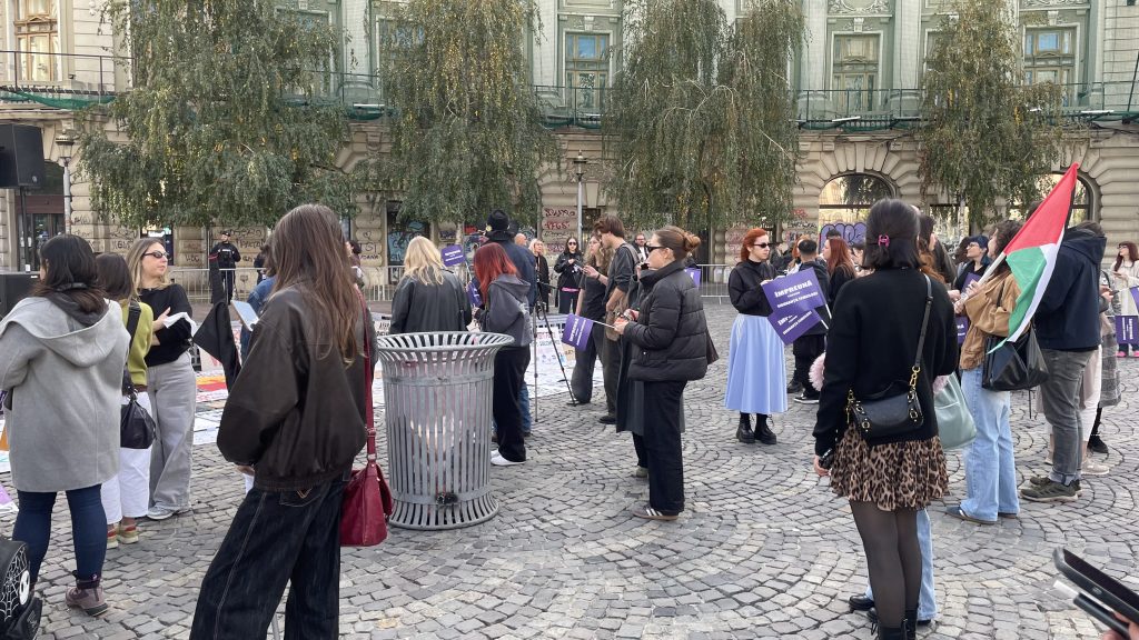 În Piața Universității din București, oamenii militează atât pentru drepturile femeilor, cât și pentru victimile genocidului din Palestina și pentru drepturile minorităților din România.