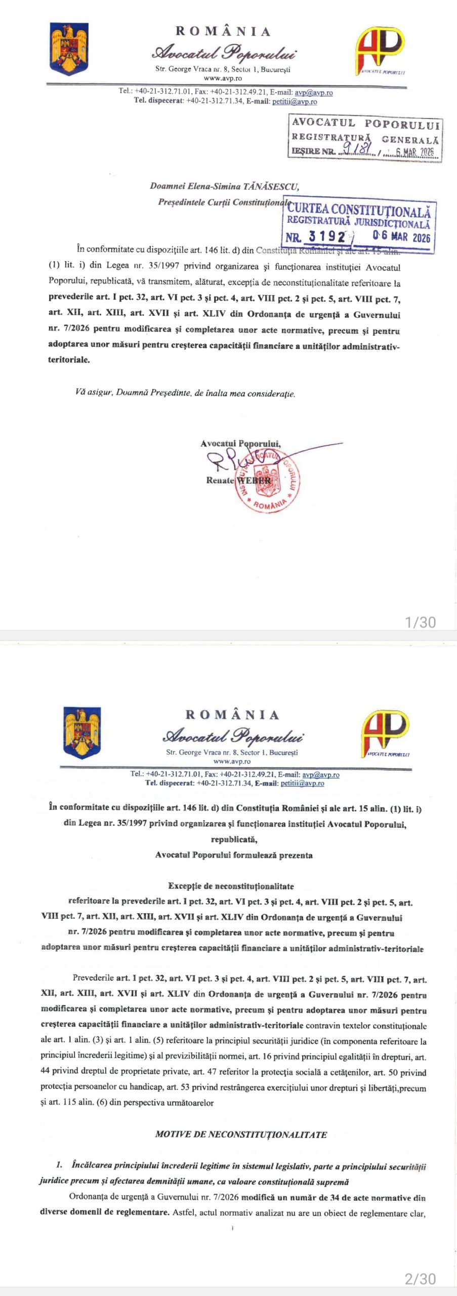 Instituția Avocatului Poporului a sesizat Curtea Constituțională a României privind aspecte de neconstituționalitate în legătură cu Ordonanța de Urgență a Guvernului nr 7 din 2026, care are ca subiect reforma Administrației Publice centrale și locale.